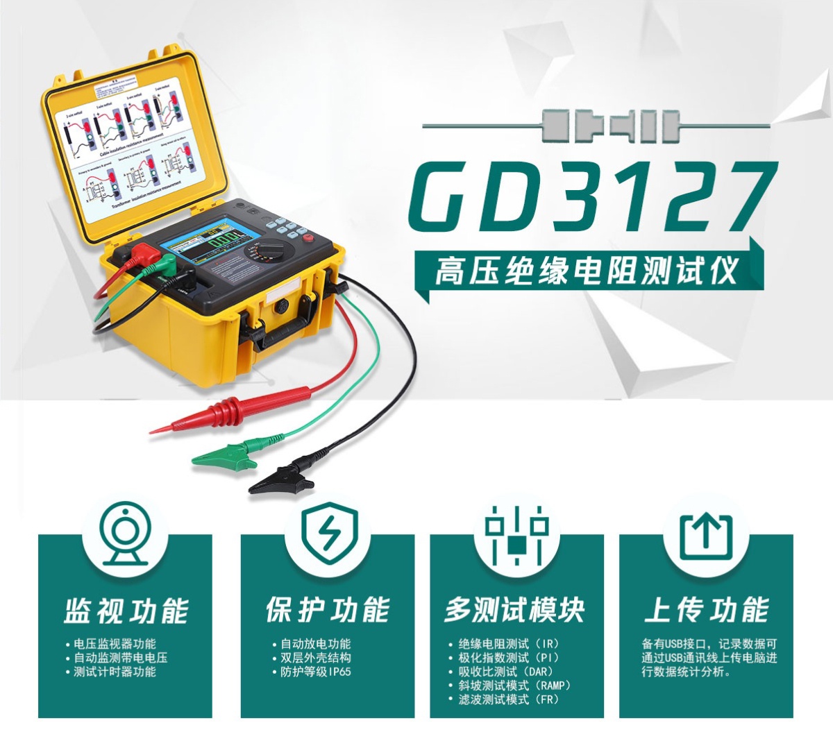 GD3127系列絕緣電阻測試儀量程寬廣,分辨率高,操作便捷,堅固耐用,準確可靠、性能穩定,抗干擾能力強。儀表具有絕緣電阻測試(IR);極化指數測試(PI);吸收比測試(DAR);斜坡測試(RAMP);濾波測試(10S、20S、30S、40S四種選擇);電壓測試(V);電流測試(nA),電壓監視器,測試計時器等功能。
