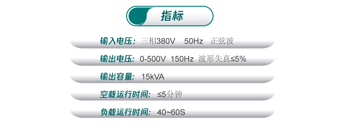 - 本產品可作為變壓器及相應容量電器作感應耐壓試驗或作短時運行的150Hz電源用。