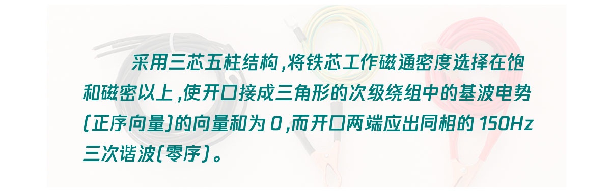 采用三芯五柱結構,將鐵芯工作磁通密度選擇在飽和磁密以上,使開口接成三角形的次級繞組中的基波電勢(正序向量)的向量和為0,而開口兩端應出同相的150Hz三次諧波(零序)。