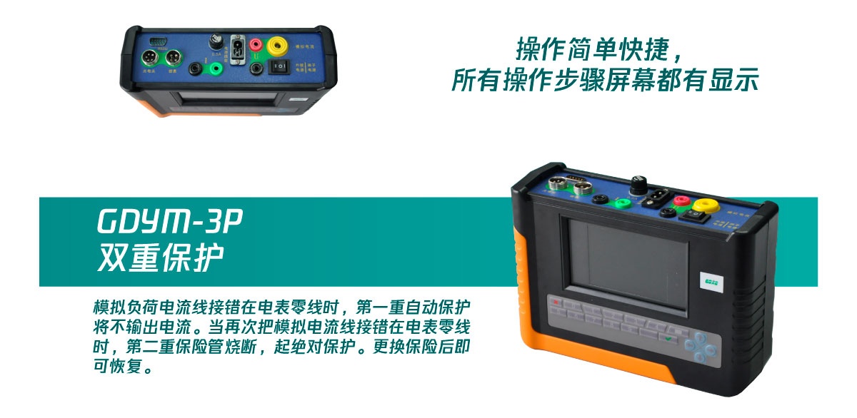 · 模擬負荷電流線接錯在電表零線時,重自動保護將不輸出電流。當再次把模擬電流線接錯在電表零線時,第二重保險管燒斷,起保護。更換保險后即可恢復;