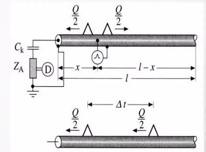 振蕩波電壓下的電纜局部放電定位技術是根據電磁波傳輸反射原理,即在缺陷處產生的局部放電脈沖向電纜兩端傳播,在電纜端頭處如果沒有匹配阻抗,局部放電脈沖將在端頭處反射。國電西高根據在測量端測量的第一個沿測量端傳輸的脈沖及經另一端反射后傳回測量端脈沖的時間差即可算出缺陷距離測量端的距離,從而定位出缺陷的位置。