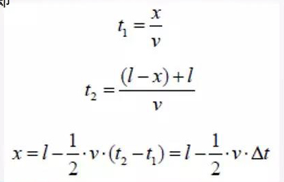 其原理示意如圖3所示。測試一條長度為l的電纜,假設在距測試端x處發生局部放電,脈沖將沿電纜向兩個相反方向傳播,其中一個脈沖經過時間t1到達測試端;另一個脈沖向測試端的對端傳播,并在對端發生反射,之后再向測試端傳播,經過時間t2到達測試端。根據兩個脈沖到達測試端的時間差,可計算局部放電發生位置,即