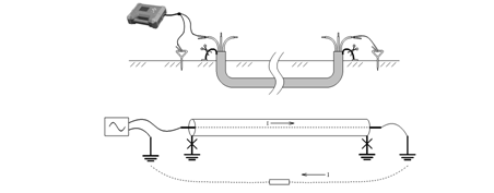電流自發射機流經芯線,在電纜對端進入大地,流回近端返回發射機。這種接法在地面探測時接收機可以感應到很強的信號國電西高信號特性比較明確,可以充分利用儀器的防誤跟蹤功能;信號在絕緣良好的芯線上流過,不會流到鄰近管線上,尤其不會流到交叉的金屬管道上,最適于在復雜環境下進行路徑查找。另外由于電纜接地,流經電纜的信號電壓很低,不容易對鄰線產生電容耦合,減少干擾。