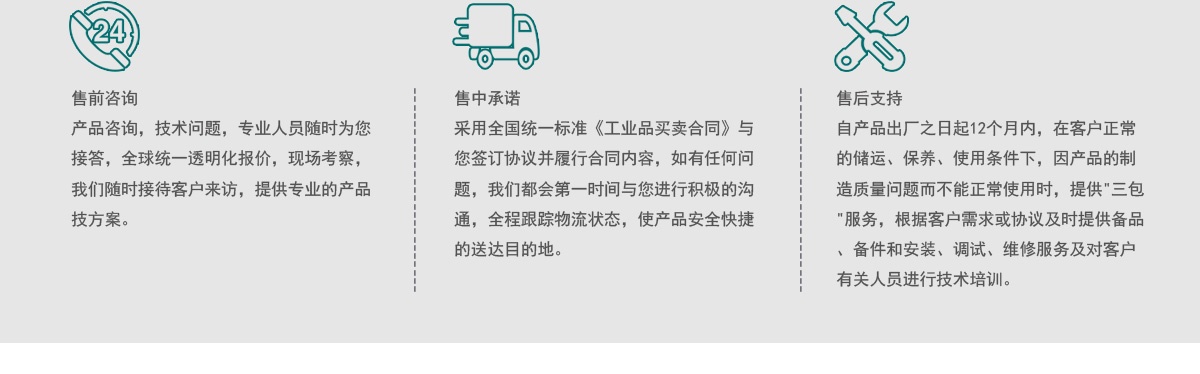 自產品出廠之日起12個月內,在客戶正常 的儲運、保養、使用條件下,因產品的制 造質量問題而不能正常使用時,提供"三包 "服務,根據客戶需求或協議及時提供備品 、備件和安裝、調試、維修服務及對客戶 有關人員進行技術培訓。