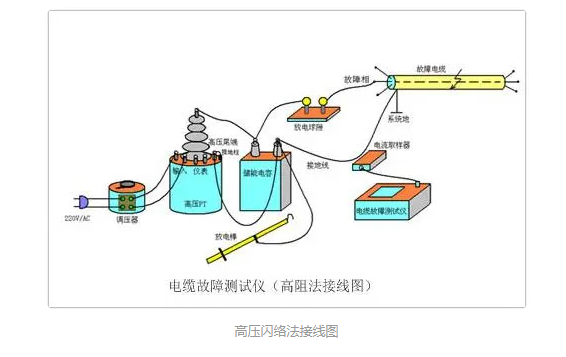 高壓閃絡法的用途正好是與跨步電壓法互補,是解決阻值大于200歐姆時的電纜故障,采用脈沖直流電壓在絕緣層最薄弱的環境產生放電現象,通過專用放大接收器接收并處理,測量過程相對比較復雜,下圖是高壓閃絡法的現場接線圖: