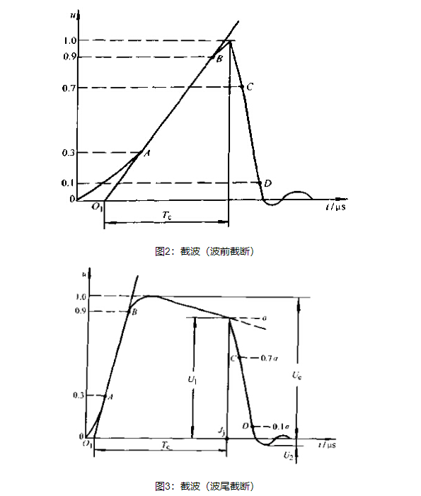 如圖2和圖3所示。表1列出了雷電沖擊電壓標準波形參數和容許偏差(CB/T169271-1997)。