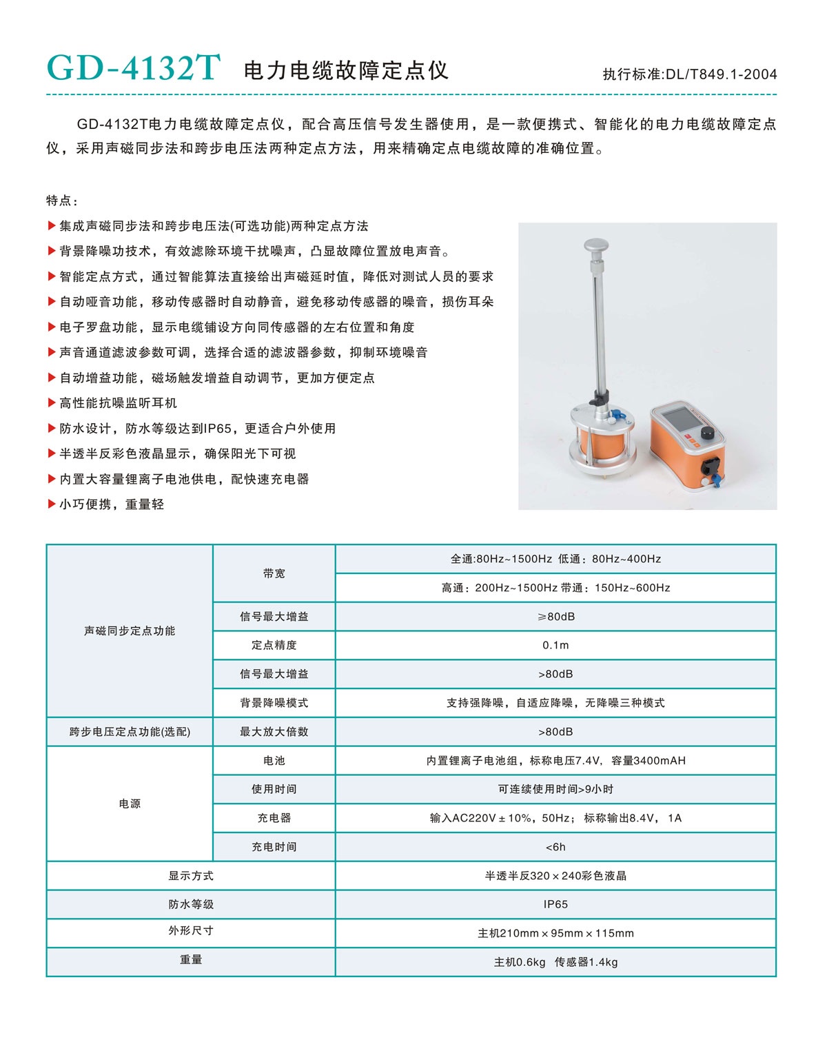 GD-4132T電力電纜故障定點儀,配合高壓信號發生器使用,是一款便攜式、智能化的電力電纜故障定點儀,采用聲磁同步法和跨步電壓法兩種定點方法,用來精確定點電纜故障的準確位置。