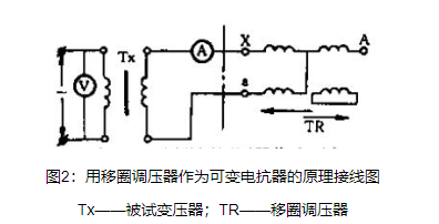 圖中,在試品的負載側與移圈調壓器的二次側相連接,當動圈上下移動時,它的阻抗就相應地變化,成為一個可變電抗器。