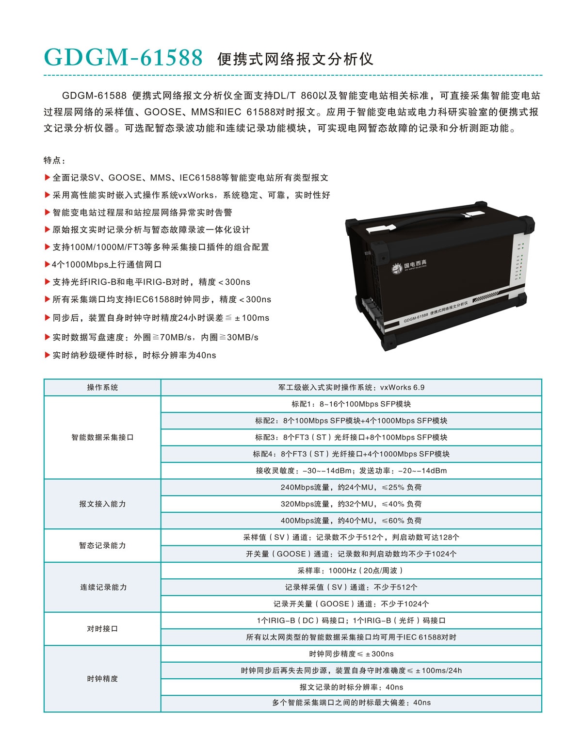 GDGM-61588便攜式網絡報文分析儀是應用于智能變電站或電力科研實驗室的便攜式網絡報文分析儀器,全面支持DL/T 860以及智能變電站相關標準,為智能變電站各類二次設備的試驗、調試、檢修提供數據參考依據。