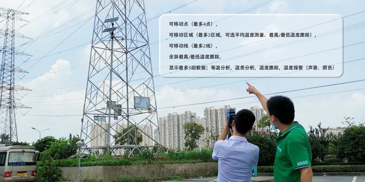測量模式 可移動點(最多4點),可移動區域(最多3區域,可選平均溫度測量、最高/最低溫度跟蹤),可移動線(最多2線),全屏最高/最低溫度跟蹤,顯示最多5組數據;等溫分析,溫差分析,溫度跟蹤,溫度報警(聲音、顏色)